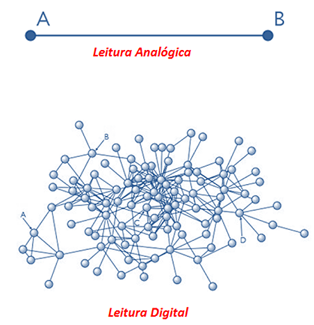 Por analógica, é possível entender aquele tipo de leitura linear, em que você parte do ponto A para o ponto B de maneira retilínea, isto é, em um movimento de reta constante do início ao fim da leitura, o texto analógico, geralmente, produz uma leitura analógica. Um texto em suporte físico, de papel, pode ser considerado como um texto de caráter mais analógico, o leitor inicia e termina a sua leitura e, em alguns casos, somente ao término dessa ação (ler), busca outras fontes, outros materiais complementares.